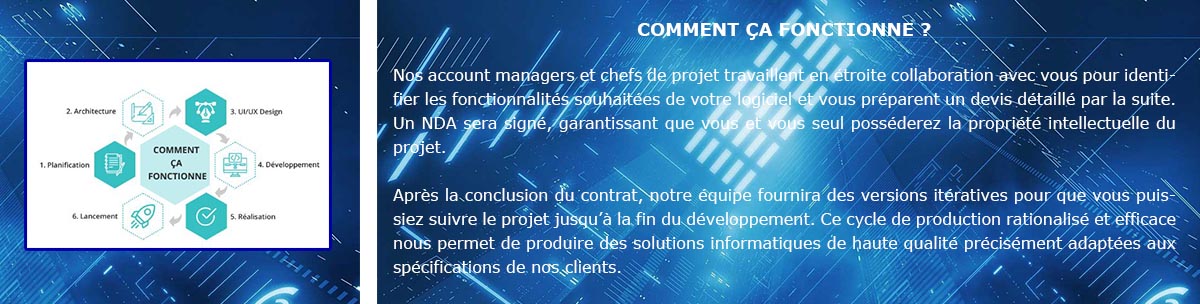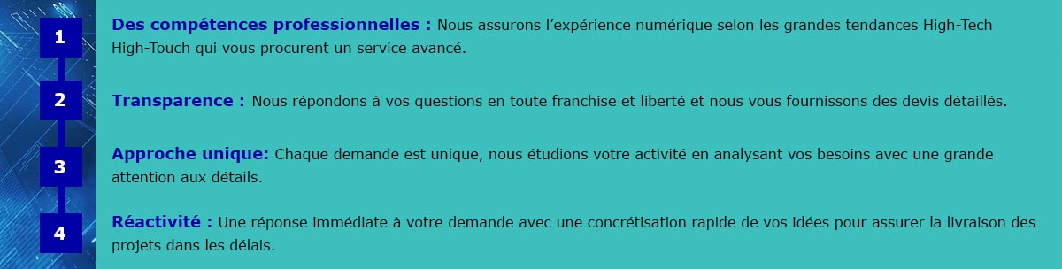 Leader dans le domaine de conception et du développement numérique sur mesure et d'une expérience qualifiée. Notre objectif est d’assister l’avancement de vos activités et de combler l’écart de vos besoins technologiques.